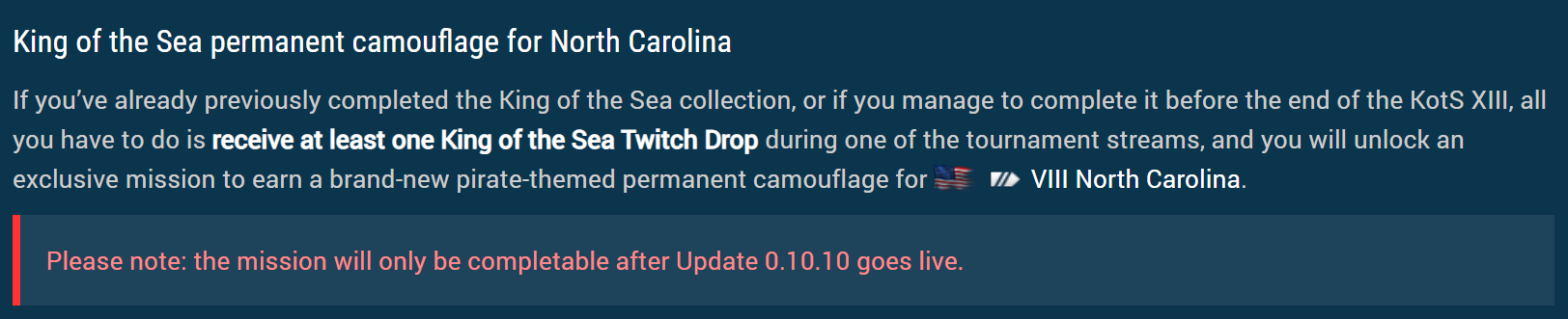 2,019 [WOLF4] _GreyBeard_ Beta Testers, In AlfaTesters 2,730 posts 21,575 battles Report post #9 Posted November 10, 2021 28 minutes ago, LTC_Tiger said: @Boggzy To confirm: If I obtained my last KOTS container on Sunday and completed the collection using the container from Sunday's drop, I should be credited with the camo mission. 27 minutes ago, Boggzy said: Correct! I really hope so or you guys are looking at another youknowwhatshow in the coming days. Personally I read it the same as, 28 minutes ago, Ensign_Cthulhu said: OK, this is not what I understood to be the case; I thought we had to have it finished, THEN get another drop. Does your statement reflect an "altering of the bargain", albeit in a generous direction? where you have to have completed the collection and then regardless of when you completed it get one more drop to qualify for the mission. That is exactly what it says in the news article as well (quote and screenshot), Quote King of the Sea permanent camouflage for North Carolina If you’ve already previously completed the King of the Sea collection, or if you manage to complete it before the end of the KotS XIII, all you have to do is receive at least one King of the Sea Twitch Drop during one of the tournament streams, and you will unlock an exclusive mission to earn a brand-new pirate-themed permanent camouflage for VIII North Carolina. it doesn't say or mean the last drop you get for completing the collection also qualifies for the mission. It says you have to get one more drop afterward to get the mission. 1 Share this post Link to post Share on other sites